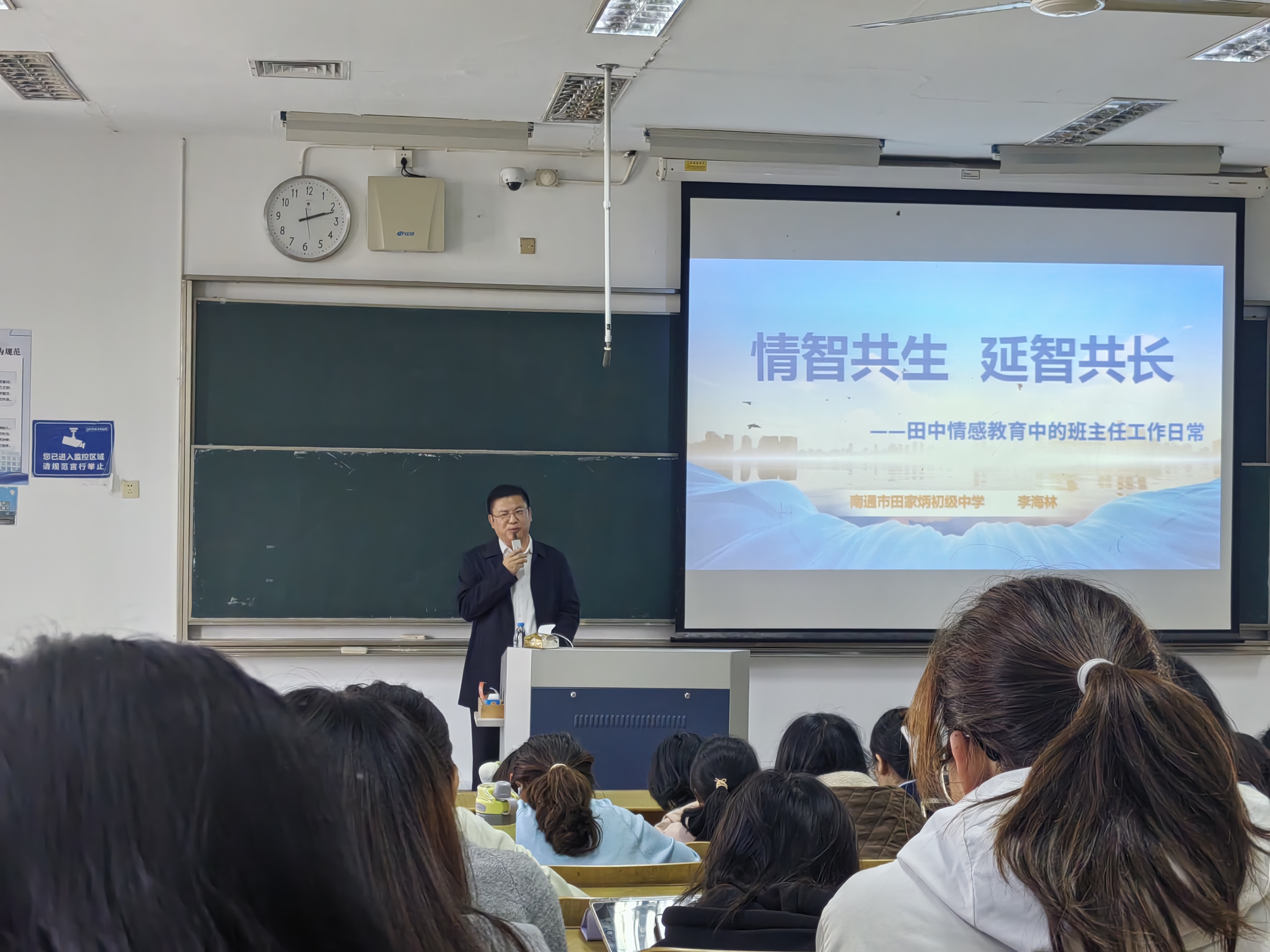 11月5日下午,线上娱乐城 面向英语(师范)专业学生举办以“情智共生、延智共长”为主题的中学班主任经验分享会。南通市田家炳初级中学资深班主任李海林老师应邀为线上娱乐城 师范生分享其三十余年的班级管理智慧,助力未来教师夯实育人理念、提升实践能力。